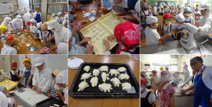 まずは、パンの成形からです。はじめに、パンの特級技能士の資格をお持ちの藤井憲一先生に形の作り方を教えてもらいました。やわらかい生地が指にくっつかないように気をつけながら、コッペパンの形にするのはとても難しく、各グループについてくださった関西食品のスタッフのみなさんが優しく手助けしてくださいました。小さなコッペパンを作った後は、カニやカメ、アンパンマンなどいろんな形のパンを作りました。