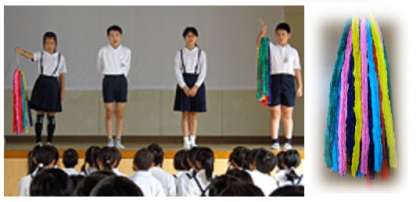 全学年で協力して折り、でき上がった千羽鶴を、今朝、児童朝会でみんなにお披露目しました。