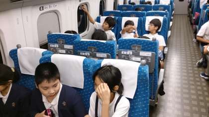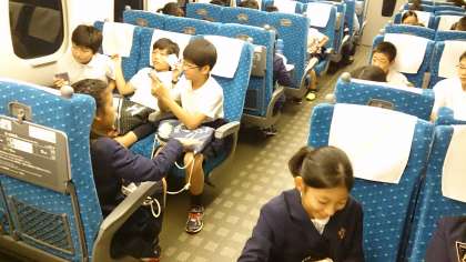 8時24分発ののぞみ1号に乗車しました。トランプなどしながら楽しく過ごしています。新神戸を過ぎたらおやつタイムです。