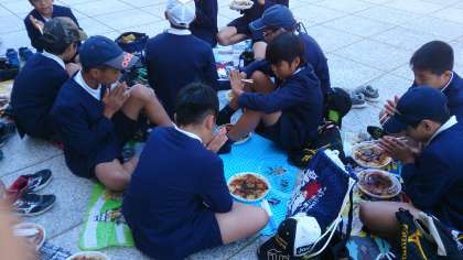 焼きたてアツアツのお好み焼きのお弁当が届きました。みんなで一緒にいただきます。