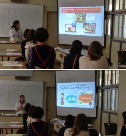 PTA副会長と教頭の挨拶の後、本校栄養教諭より大阪市の学校給食についての説明と『適塩生活で健康に』と題したお話がありました。