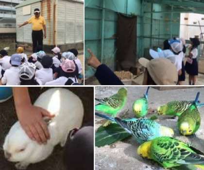 いつもは、飼育小屋にいるウサギとインコを外から見ているだけでしたが、今日は、ウサギとふれ合ったり、インコのそばに行って何羽いるか数えたりしました。