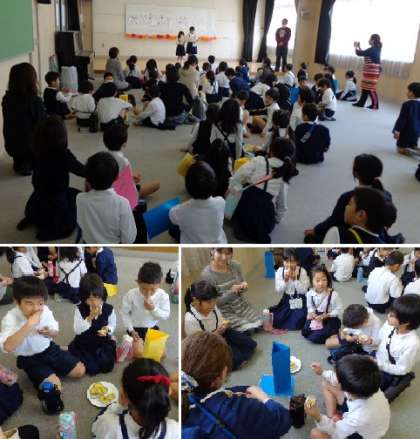 4時間目には、協力してくださった保護者のみなさんと、1年生を招待してみんなでおいもパーティを開催しました。