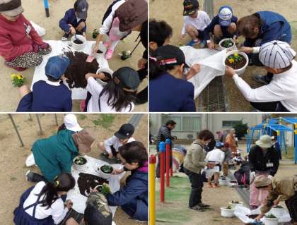 友和会の方々に優しく丁寧に教えてもらいながら、子どもたちは自分の鉢にパンジーを植えつけていきました。