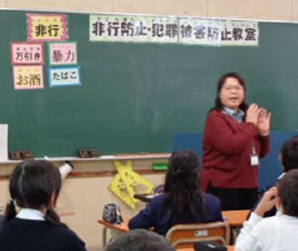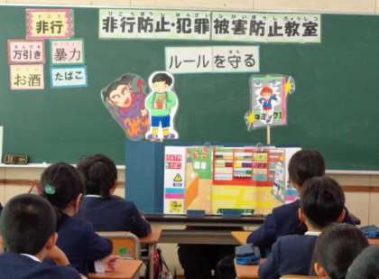 「非行」とは悪い行いのことで、法律やルールを破る行いであること、社会のルールを守る大切さなどについて、ペープサートを使って分かりやすく説明していただきました。