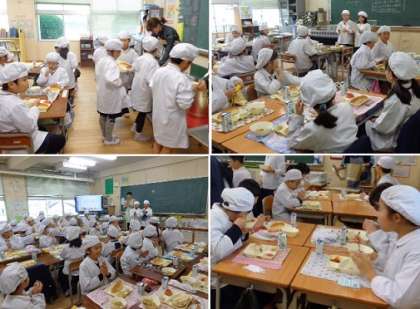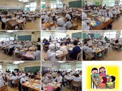 今回は、1年と2年、3年と4年、5年と6年の隣接学年がペアとなり、それぞれの教室で一緒に給食を食べました。