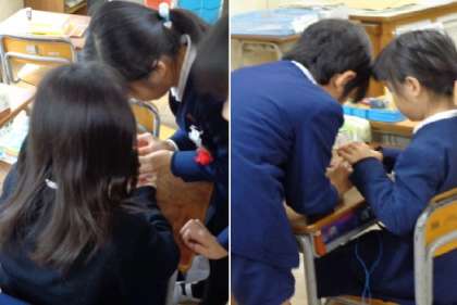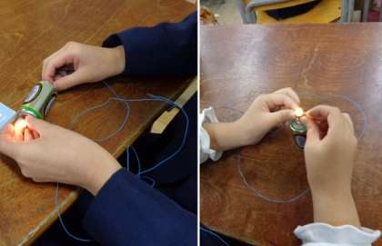 3年生が理科「電気であかりをつけよう」の学習で、電池に豆電球をどのようにつなぐとあかりがつくのかを考えて、実験を行っていました。