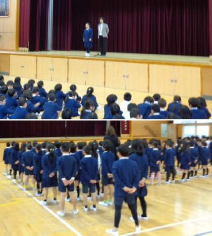 始業式では、大きな声で新年の挨拶をし、校長先生のお話を聞きました。校長先生からは、新しい友だちの紹介のあと、2学期の終業式に出した宿題「自分のものを片付けよう」についてお話がありました。