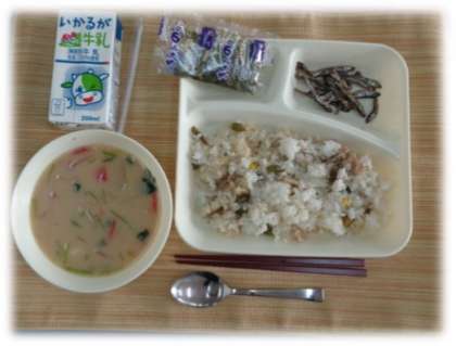 今日の給食は『正月の行事献立』で「れんこんのちらしずし、ぞう煮、ごまめ」でした。
