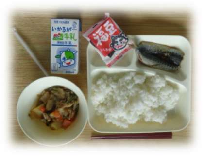 今日の給食は『節分の行事献立』で「いわしのしょうがじょうゆがけ、含め煮、いり大豆、ごはん、牛乳」でした。