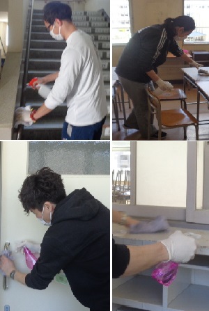 教室やくつばこ、階段やトイレなどを消毒し、明日の全員登校に備えています。