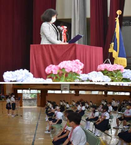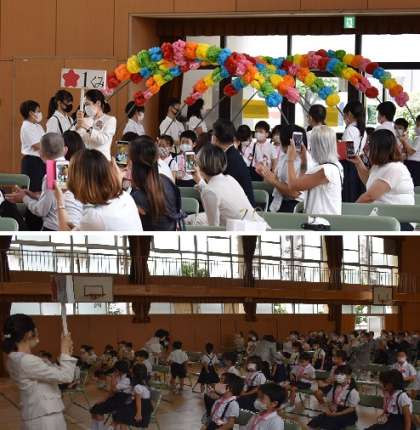 保護者のみなさんの見守る中、メダルをかけた可愛い1年生が、音楽に合わせ花のアーチをくぐって入場してきました。4月に突然延期になってから2か月ぶりの「入学式」でした。