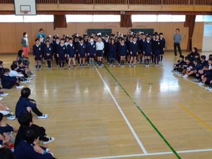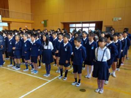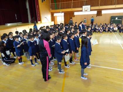12月9日(火)の児童朝会では、低・中・高学年が、それぞれ、詩を読みました。