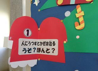 今月の保健室前の掲示板は、「かぜ」に関する豆知識をクイズ形式で学ぶことができるようになっています。