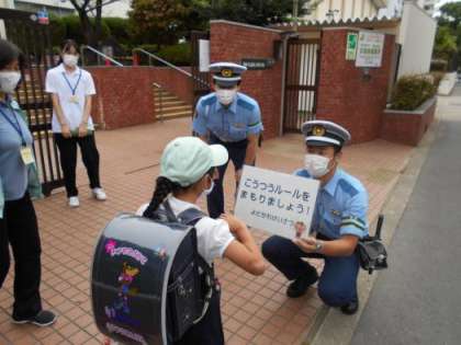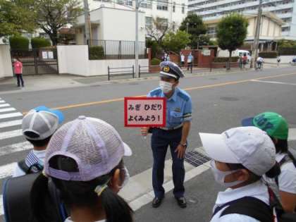 淀川警察や大阪府警本部からたくさんのお巡りさんが来られ、正門近くの通学路を中心に、子どもたちや地域の方へ交通安全を呼びかけてくださいました。