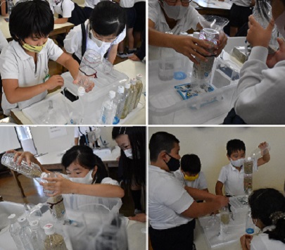 DVDを視聴したあと、水のろ過実験、どの水がおいしいかを比べる「きき水」などを行いました。