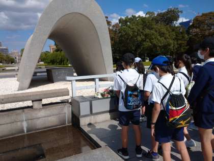 昼食後はフィールドワークをしています。原爆慰霊碑の前で平和を祈りました。