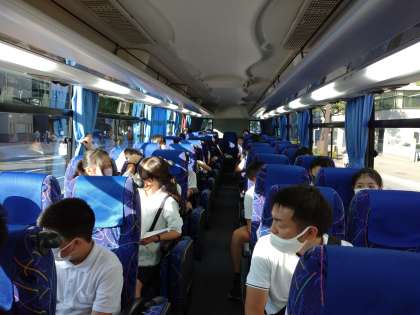 一日目の予定を終え、宿舎へ向かっています。バスに乗って出発しました。5時半ごろには着く予定です。みんな元気です。