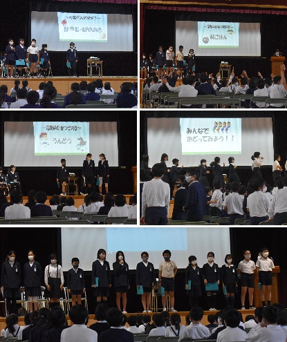 はじめに、保健委員会が寸劇などを交えながら「早寝・早起き・朝ごはん・運動」の大切さについて発表しました。「朝ごはん」の大切さを伝える場面では、給食委員の協力もありました。「運動」の大切さを伝える場面では、「みんなで踊ろう」のコーナーも!