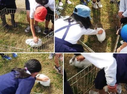 校内で飼育しているうさぎ、「ハク」とふれあえるチャンスということで、たくさんの子どもたちが集まっていました。こわごわ撫でてみる子や、飼育委員の6年生や5年生に話を聞く子など、「ふわふわしてる。」「かわいいー」と口々に感想を言っていました。