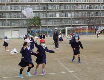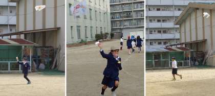 そんな中、1年生が自分たちでつくった『凧』を持って、元気に運動場へ飛び出していきました。