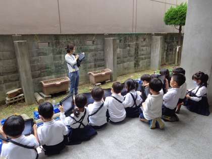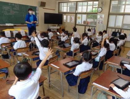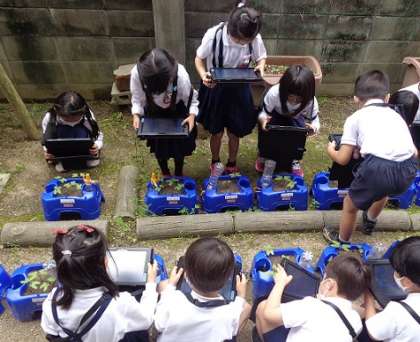 1年生が初めて、タブレット端末を使った学習を行いました。ICT教育アシスタントの先生にも協力してもらいながらログインを行い、朝顔の写真を撮ったり、お絵描きをしたりしました。
