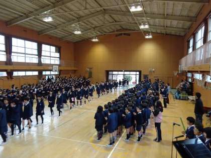 6年生が入場。緊張した面持ちでひな壇に座りました。