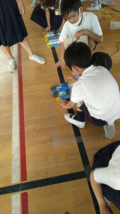 学習の様子です。どのようにしたら遠くまで走らせることができるか、話し合いながら工夫してみました。