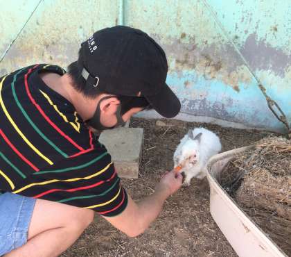 しいく委員会の児童が、ウサギのハクちゃんとセキセイインコの世話をしています。