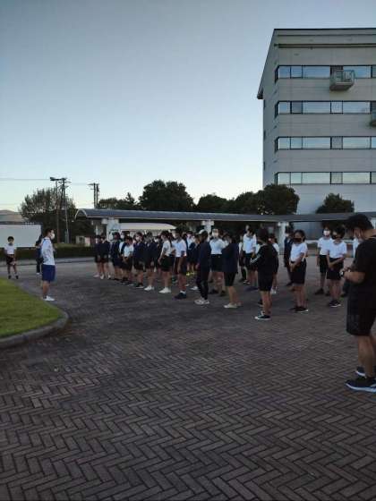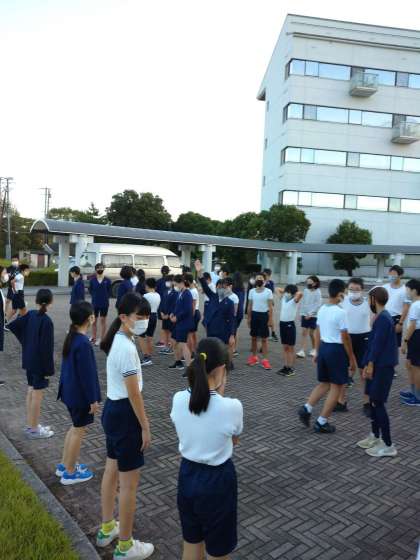 朝の会のようすです。空はよく晴れて清々しい天気です。