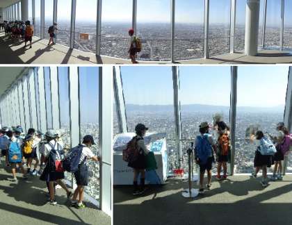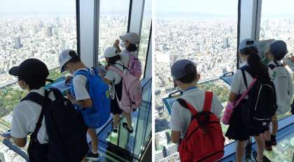 また、「あべのハルカス」では天候にも恵まれ、地上300mの展望台から大阪の街を一望することができました。子どもたちは、天王寺公園や動物園の広さに驚いたり、遠くに大阪城を見つけて声をあげたりしていました。