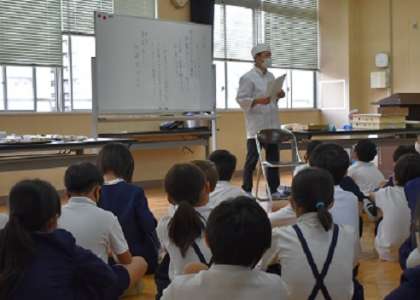 子どもたちからは、「和菓子職人になるにはどれくらい修業されましたか?」「どんな和菓子が人気ですか?」「和菓子を作っていてうれしいことは何ですか?」などなど、いろんな質問が次々と出され、時間がたりないほどでした。