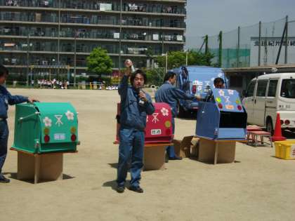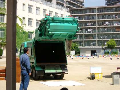 4月24日(金)には、大阪市東北環境事業センターから、普及啓発担当の方々が、実際にパッカー車に乗って来てくださいました。