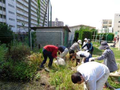 日差しのきつい中、校庭のコースに来てくださった方々は、池の周りの草引きをしてくださいました。