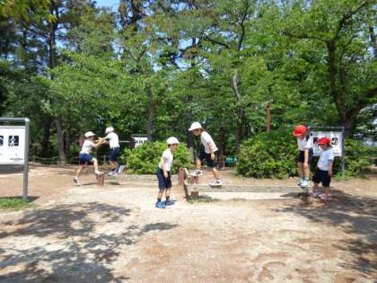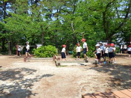 他の学校の子どもたちもやってきて、大型のコンビネーション遊具が混み始めたためか、アスレチック広場で遊ぶ子どもが増えてきました。