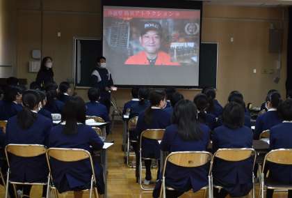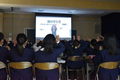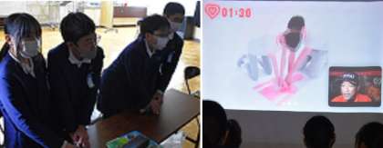 映像を見て災害に関するクイズに答えたり、リモートで防災について意見を述べたりしました。最後には、ペットボトルを使った心臓マッサージ体験も行いました。