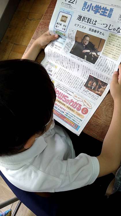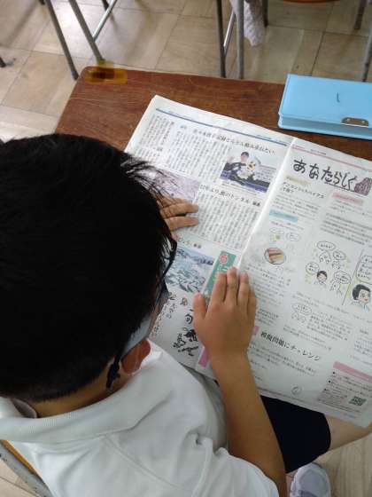 3年生児童が、毎日小学生新聞と朝日小学生新聞を読んでいます。興味をもったことを進んで読んでいます。