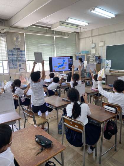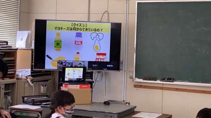 キューピー五霞工場とオンラインでつないでいます。マヨネーズのヒミツについて学んでいます。なにからできているか、クイズで考えました。
