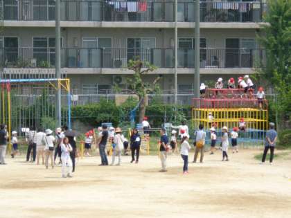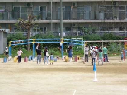 1年生は、運動場で体育(運動場北側にある遊具を使って運動する姿や「まとあて」の様子)を見ていただきました。最後はみんなでドッジボール。