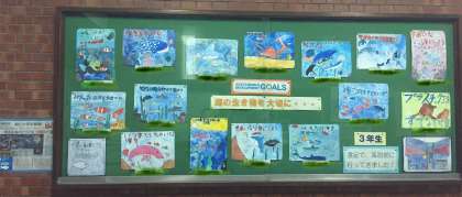 3年生の作品です。玄関前に掲示しています。SDGsにからめて学習しました。