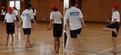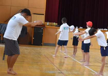 残念ながら、プールではなく体育館での講座となりましたが、ゲストティーチャー2人に来ていただき、平泳ぎのキックのしかたや手のかきかたなど、大事なポイントをわかりやすく教えてもらいました。子どもたちは集中しながらも楽しそうに練習に取り組んでいました。