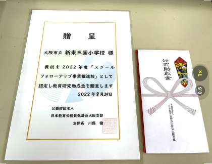 公益財団法人 日本教育公務員弘済会大阪支部より、スクールフォローアップ助成金を贈呈していただきました。