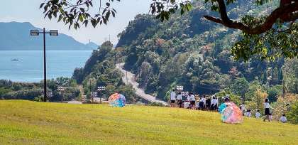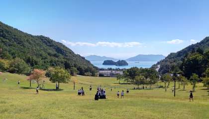 閉舎式までの時間を、広い芝生で思い思いに過ごしています。