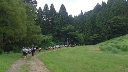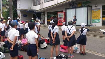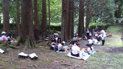 11時50分に宿舎に到着しました。宿舎の前で開舎式を行いました。司会の人も、代表のあいさつの人も、しっかりとおはなしができました。お天気もよいので、お弁当は魚つかみをする川の近くで食べることにしました。林の中はとても涼しいです。