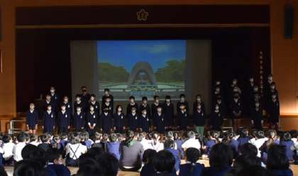 今朝の児童集会で、6年生が全校児童に向け、修学旅行を通して学んだことの報告をしました。