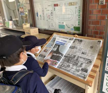玄関に、読売新聞社から寄贈していただいた新聞閲覧台を配置しています。児童は、登校時に、複数の小学生新聞を閲覧していました。