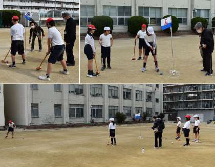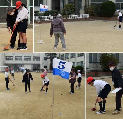 グラウンドゴルフ第2弾は、4年2組と地域の方との交流でした。1組の時と同様、お天気にも恵まれ、楽しくプレーすることができました。