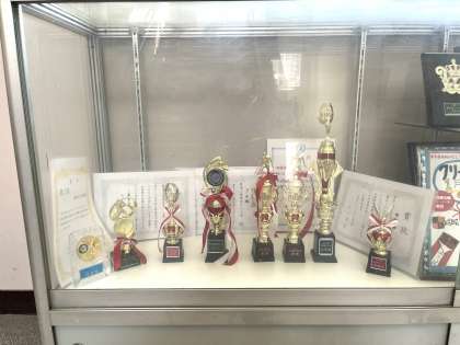 連合子ども会で、キックベースボールとソフトボールのチームは、今年も沢山の賞をいただきました。校長室前の表彰ケースに賞状とトロフィーを掲示しています。