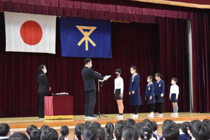 はじめに、各学年の代表に校長先生から修了証が手渡され、校長先生からは今年一年の子どもたちの頑張りや、来年度に向けてのお話がありました。次に、春休みの安全なくらしについてのお話。最後は、マスクを着けながらではありますが、みんなで元気に校歌を歌いました。