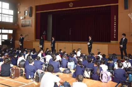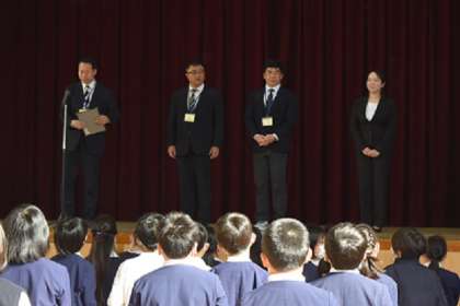 1学期の「始業式」の前に、この春の異動で、新しく新東三国小学校に赴任した教職員の「着任式」を行いました。